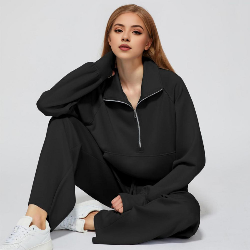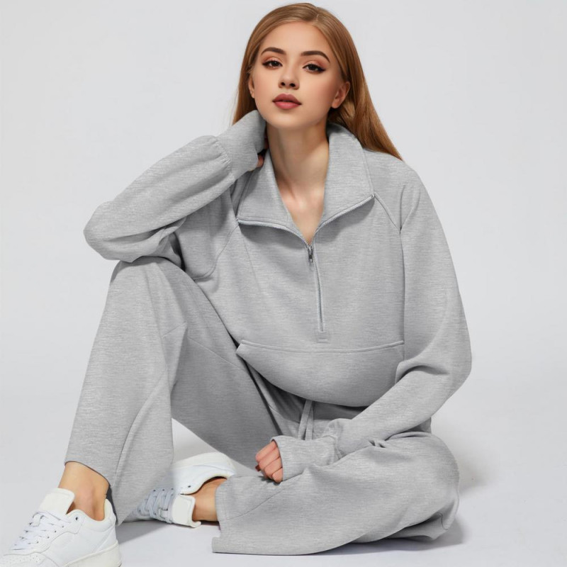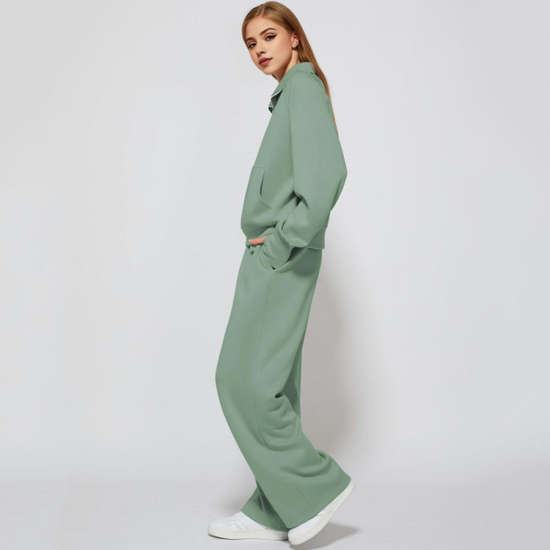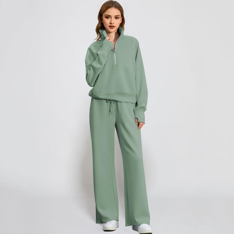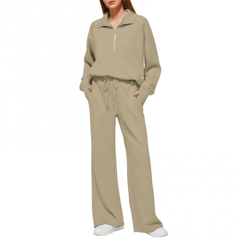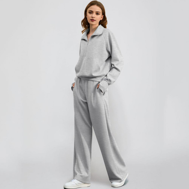 2 Pcs/Set Women Top Pants Set Half Zipper Turn-down Collar Long Sleeves Sweatshirt Elastic Waist Wide Leg Sweatpants Sport Outfit Autumn Casual Tracksuit