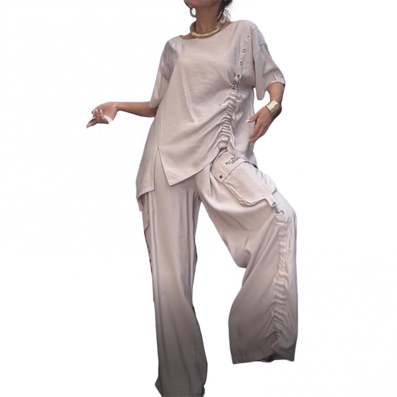 Description: This stylish and personalized two-piece suit features a short-sleeved solid color T-shirt with shirring design paired with wide-leg trousers. Made of breathable and lightweight polyester fiber, this casual set is perfect for spring, summer, and autumn. The versatile design suits most body shapes, showcasing your unique charm effortlessly. Say goodbye to outfit dilemmas with this easy-to-style ensemble that can be accessorized with necklaces, earrings, bags, and shoes for various occasions such as home, party, office, club, shopping, vacation, hiking, workout, or casual daily wear. Elevate your wardrobe with this chic and comfortable outfit!