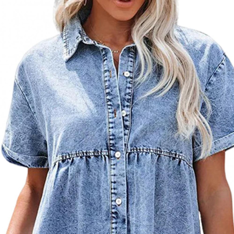 Elegant Babydoll Design: Elevate your style with this women's short babydoll dress featuring a high-waisted, loose fit design that flatters your figure. The chic layered faux denim dress boasts a button fastening and collared neckline for a touch of sophistication.