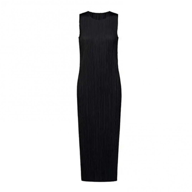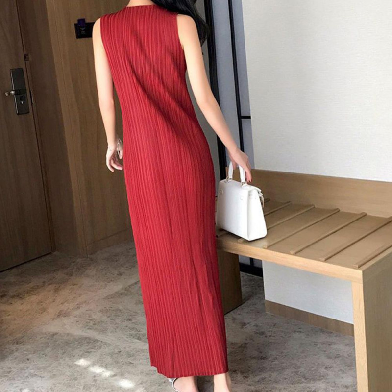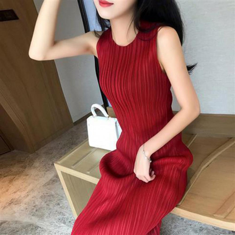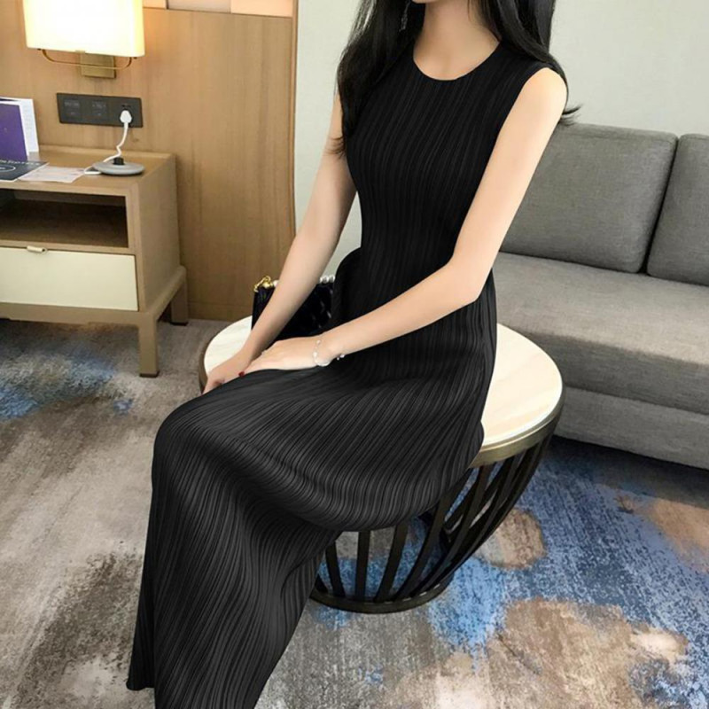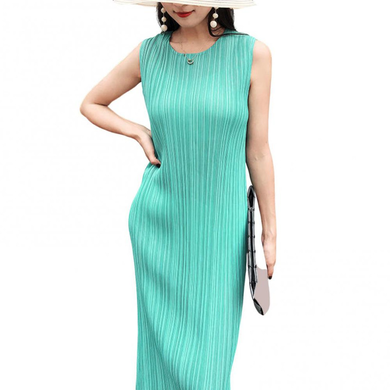 Description: This elegant women's dress is crafted from a blend of polyester and spandex, offering a soft and comfortable feel with excellent elasticity. The solid color design exudes simplicity and sophistication, perfect for showcasing your style effortlessly. Featuring a pleated round neck and sleeveless silhouette, this dress flatters your figure while keeping you on-trend. Pair it with delicate accessories like necklaces, bracelets, or earrings, along with woven bags, sandals, or heels for a chic ensemble. Whether you're heading to the office or attending a special event, this versatile dress is suitable for various occasions such as everyday wear, vacations, parties, weddings, graduations, or even beach outings. Embrace the versatility and style of this dress for any activity or event.