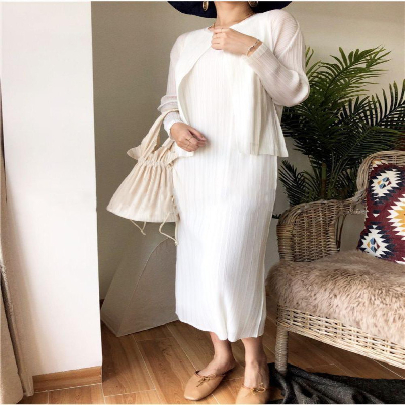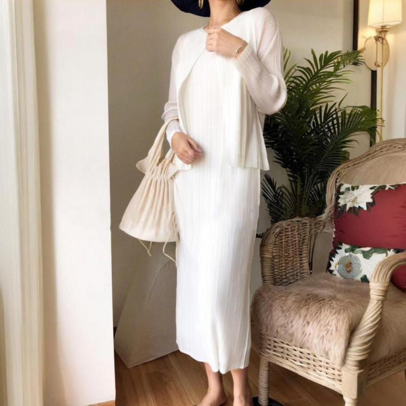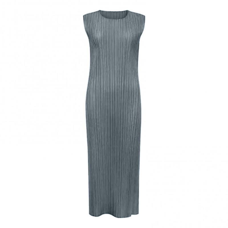 Women Vest Dress Pleated Loose Round Neck Solid Color Straight OL Commuting Dress Sleeveless Calf Length Midi Dress