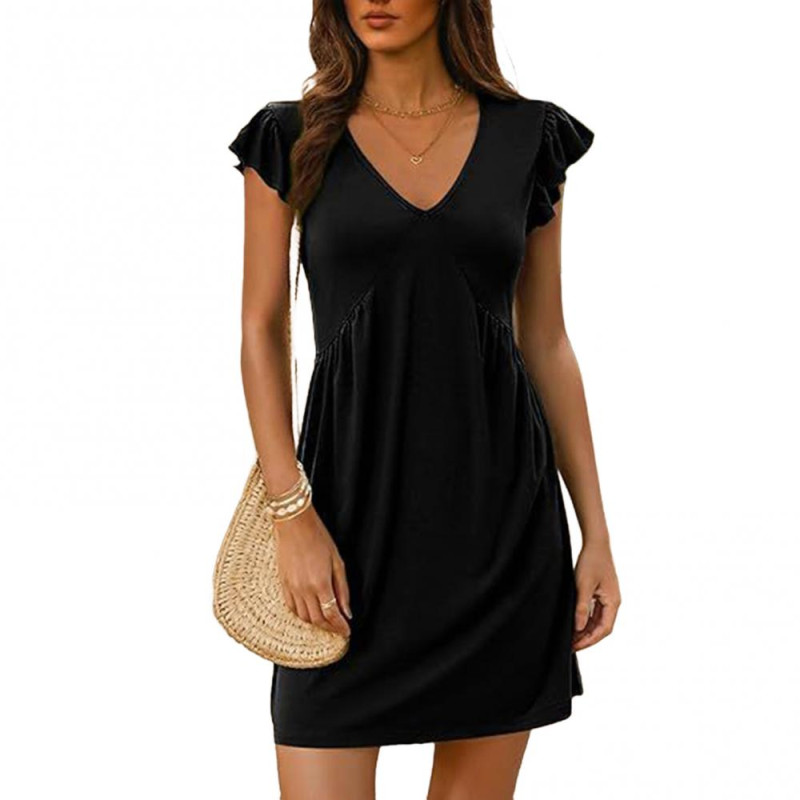 Description: This elegant women's dress is crafted from soft and lightweight polyester, offering a casual loose cut for ultimate comfort. The solid color design exudes elegance and fashion, perfect for daily wear. Featuring a sexy V-neck and stylish ruffled sleeves, this dress is versatile and chic. Pair it with delicate accessories like necklaces, bracelets, and earrings, along with woven bags or clutches, sandals, or high heels to complete your look. Embrace effortless style and comfort with this must-have summer dress.