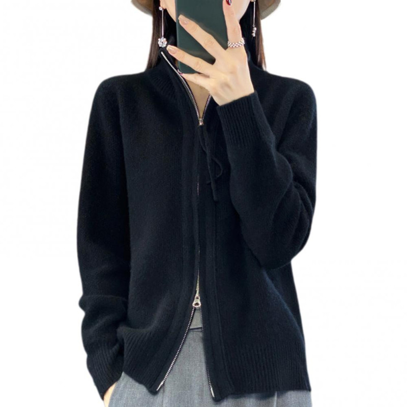 Women Knitted Sweater Coat High Collar Long Sleeve Double Zipper Placket Autumn Winter Solid Color Knitwear
