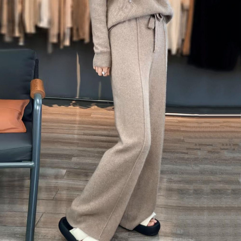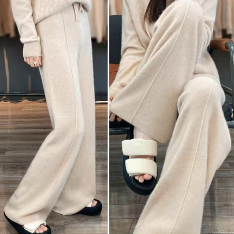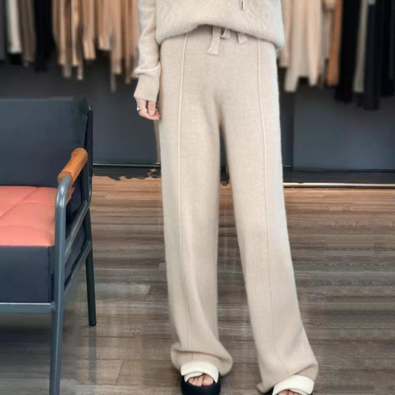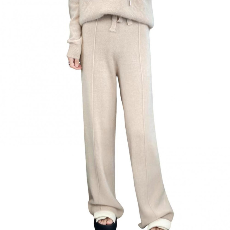 Wool Casual Pants Solid Color Straight Wide Leg Knitting Trousers with Drawstring High Waist Thickened Slacks
