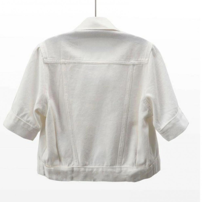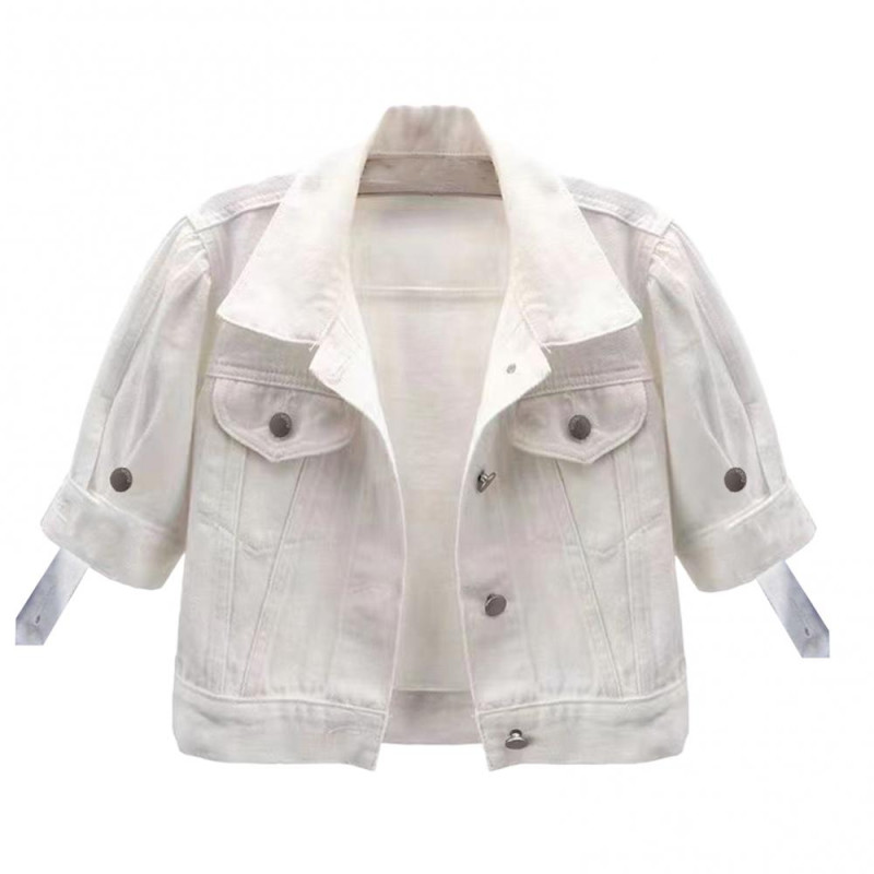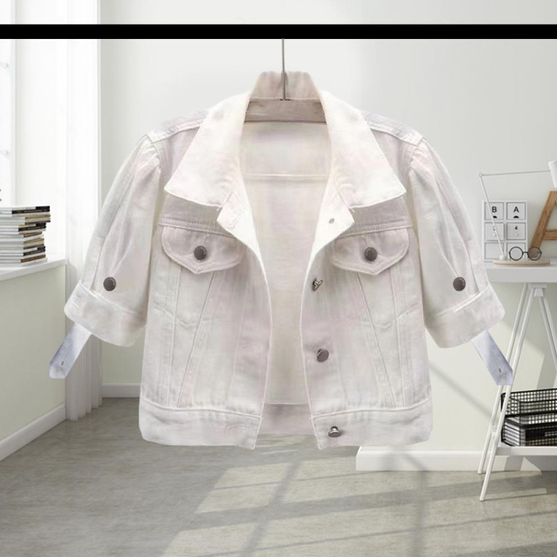 Women's Cropped Denim Jacket Short Sleeve Jean Jacket Lapel Button Down Trucker Coat Summer Casual White Thin Top