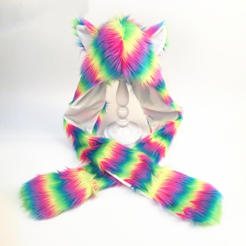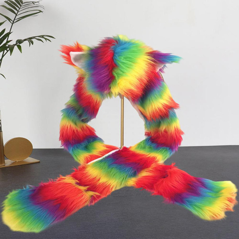 Women Hat Rainbow Color Imitation Fur 3 in 1 Hat Scarf Gloves Winter Warm Hat Home Outdoor Work Street Wear