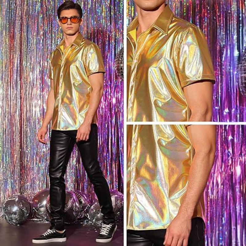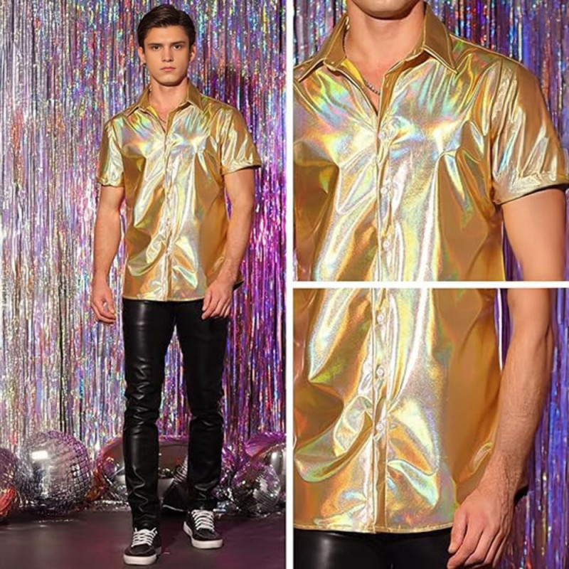 Men's Shiny Metallic Shirt Short Sleeve Lapel Shirt Button-up Sparkling Disco Outfit for Stage Performance Nightclub Dance Party Bar