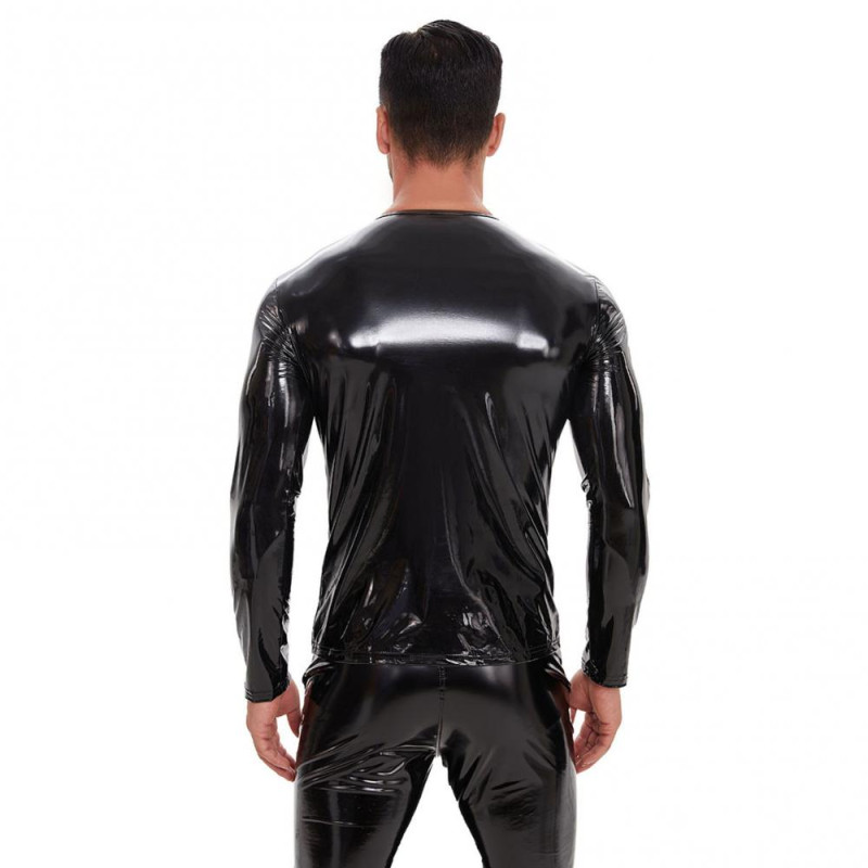 Men's Liquid Shiny Faux Leather Top Metallic Wet Look Long Sleeve Tee Zipper Shoulder Slim Fit Shirt Hip Hop Nightclub Party Blouse