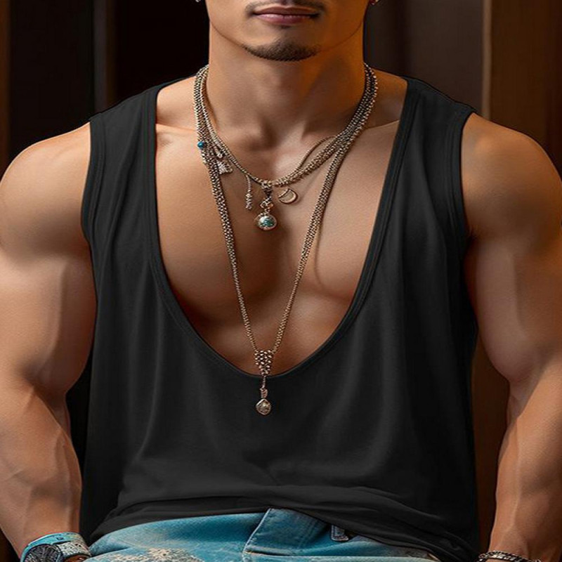 Men Sport Vest Deep V-Neck Wide Straps Sleeveless Solid Color Tank Tops Loose Fit Casual Versatile Vest