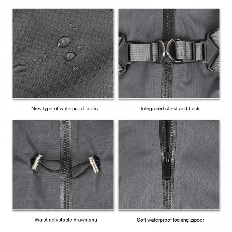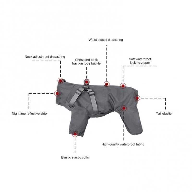 Description: This dog raincoat features a convenient built-in strap design on the back, allowing you to easily attach the leash for extra control. Simply put on the coat and secure it in place quickly! Available in various colors, making it a perfect Christmas or holiday gift for your furry friend. The rain jacket is equipped with adjustable buckles and drawstrings on the back and neck, ensuring a customized fit for your pet. It's effortless to put on and ideal for active dogs. The D-ring buckle is sturdy and can withstand strong pulling, adding convenience to your walks. Crafted from high-quality waterproof material, this puppy raincoat keeps your pet dry and clean during rainy days. The lightweight fabric offers breathability and comfort, making it suitable for walks in rainy or snowy weather. Reflective bars on the collar enhance visibility in low-light conditions, ensuring your pet's safety during night walks or adverse weather conditions. The zipper closure allows for easy on and off. Available in 6 sizes, this dog rain jacket is suitable for small to medium-sized dogs. Before purchasing, please measure your dog's size and refer to our size chart to select the perfect raincoat for your dog.