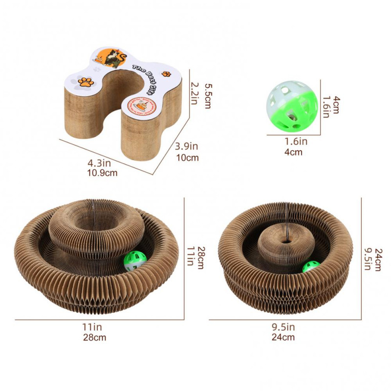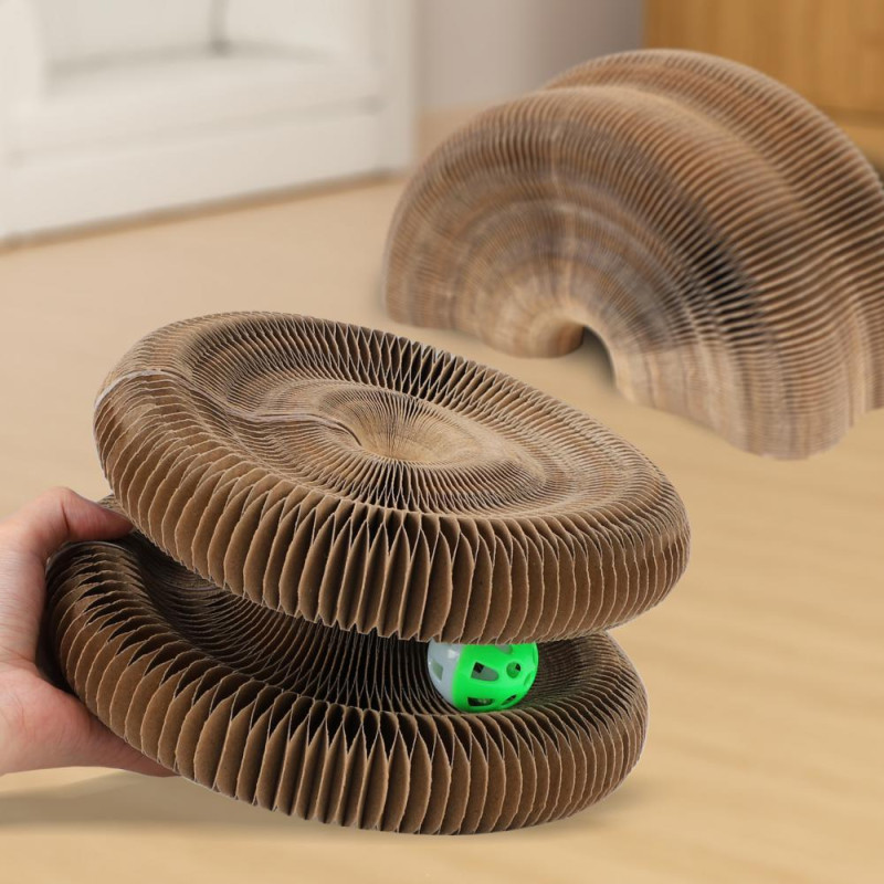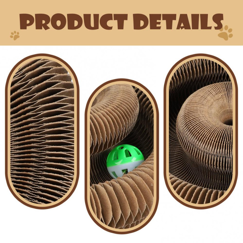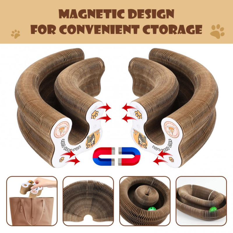 Description: Introducing the cat scratch board, a natural material cat toy that is perfect for indoor cats. Made of high-quality corrugated paper and connected by magnets, this toy is non-toxic and safe for your furry friend to play with. The foldable and portable design allows for easy storage and saves space in your home when not in use. This magic accordion cat toy can be transformed into different shapes with the bell ball inside, providing endless entertainment for your cat. Not only does it satisfy your cat's natural scratching instincts, but it also helps protect your furniture from damage. The versatility of this toy extends beyond just cats – it can also be enjoyed by humans as a stress relief toy. Bring home the cat scratch board today and keep your cat entertained while safeguarding your home furnishings.