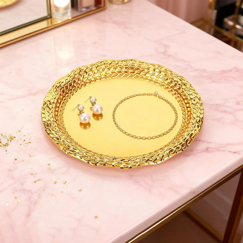 Description: Introducing our versatile storage tray, crafted from sturdy and easy-to-clean high-quality metal for long-lasting durability. This circular design is perfect for various uses, from serving snacks and cakes to organizing jewelry. The retro tea tray-inspired round metal tray features a delicate texture, adding a classic touch to any setting. Enhance your living space with this creative storage solution that doubles as a stylish decor piece. Not only functional for dining, but also ideal for storing jewelry or displaying refreshments. This environmentally friendly tray makes a practical and thoughtful gift choice, thanks to its reusable and non-toxic material. Elevate your home decor with this multipurpose storage tray today!
