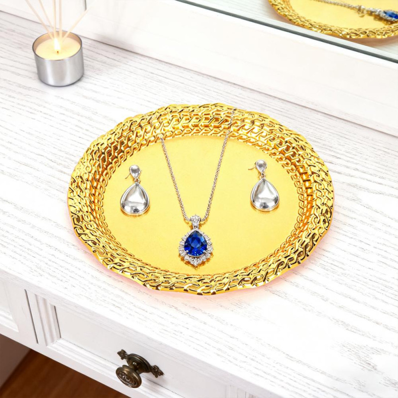 Durable Metal Construction: Crafted from high-quality metal, this storage tray offers exceptional durability and easy maintenance. Its sturdy build ensures long-lasting performance, making it ideal for daily use without compromising on quality or style. Versatile Circular Design: The circular shape of this metal dessert tray lends itself to a myriad of applications, from serving snacks and desserts to organizing jewelry. Its adaptable design seamlessly fits into various home settings, adding a touch of elegance and functionality to any occasion. Retro Tea Tray Aesthetic: Embrace a classic yet stylish look with this round metal tray featuring a retro tea tray design. The intricate metal texture exudes sophistication, elevating your desktop decor with a timeless charm that complements any interior theme. Creative Storage Solution: Beyond its role as a dining essential, this metal desktop organizer serves as a creative storage solution for jewelry and refreshments. Enhance your living space with practical functionality and aesthetic appeal, transforming it into a chic and organized environment that reflects your unique style. Eco-Friendly Gift Option: Made from safe and non-toxic materials, this metal storage tray is an environmentally friendly choice that reduces the need for disposable tableware. Consider it as a thoughtful gift for loved ones, offering both practical utility and decorative charm for everyday use or special occasions.
