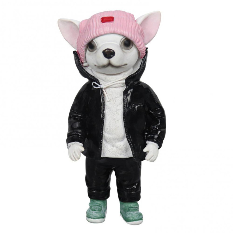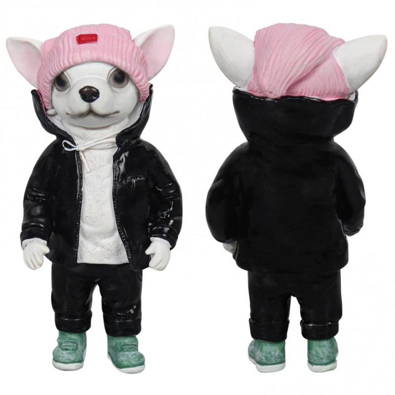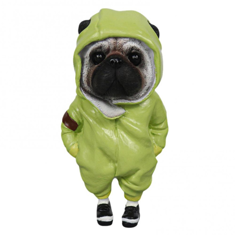 Stylish Outfits: Each dog statue showcases a diverse wardrobe, from a trendy black hoodie to a cozy green onesie, offering versatile styling options for any decor theme.