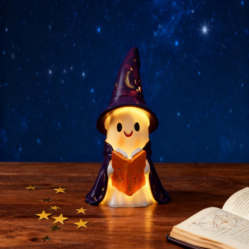 Charming Ghost Design: Featuring a delightful ghost figure donning a wizard hat adorned with moon and stars, this lamp exudes a friendly aura with its cute smile, making it an enchanting addition to any space seeking a touch of whimsical charm.