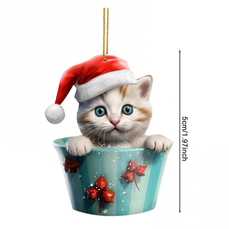 Christmas Pendant 2D Acrylic Cat Sitting Mug Charm Hanging Decor with Lanyard Holiday Party Decoration