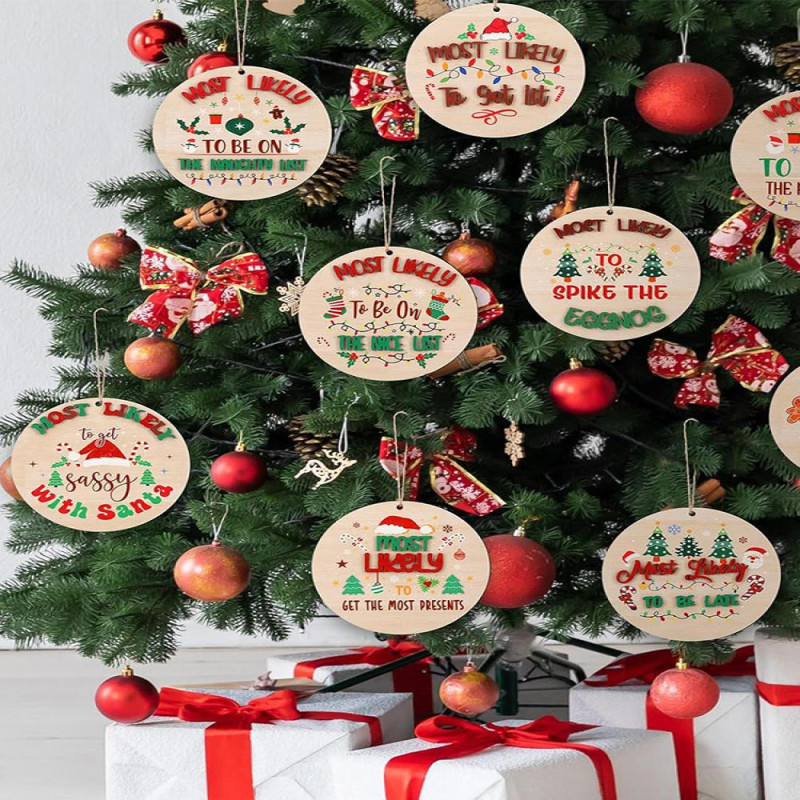Description: Add a touch of festive charm to your Christmas decor with these delightful Christmas tree decoration pendants. Crafted from natural wooden discs, each pendant features colorful three-dimensional characters and patterns that create a warm and inviting atmosphere. Classic Christmas symbols like trees, gingerbread men, snowmen, and more adorn these pendants, adding a traditional yet whimsical touch to your holiday display. With playful and humorous Christmas-themed slogans on each pendant, such as "Most Likely to Eat Santa's Cookies" or "Most Likely to Spike the Eggnog," these decorations are sure to bring a smile to your face. Easy to hang with the included thin rope, these lightweight pendants can be displayed on Christmas trees, door frames, or walls. Perfect for family gatherings, office parties, or gift exchanges, these versatile decorations add a fun and festive element to any holiday celebration. Bring joy and laughter to your home this holiday season with these charming Christmas tree decoration pendants.