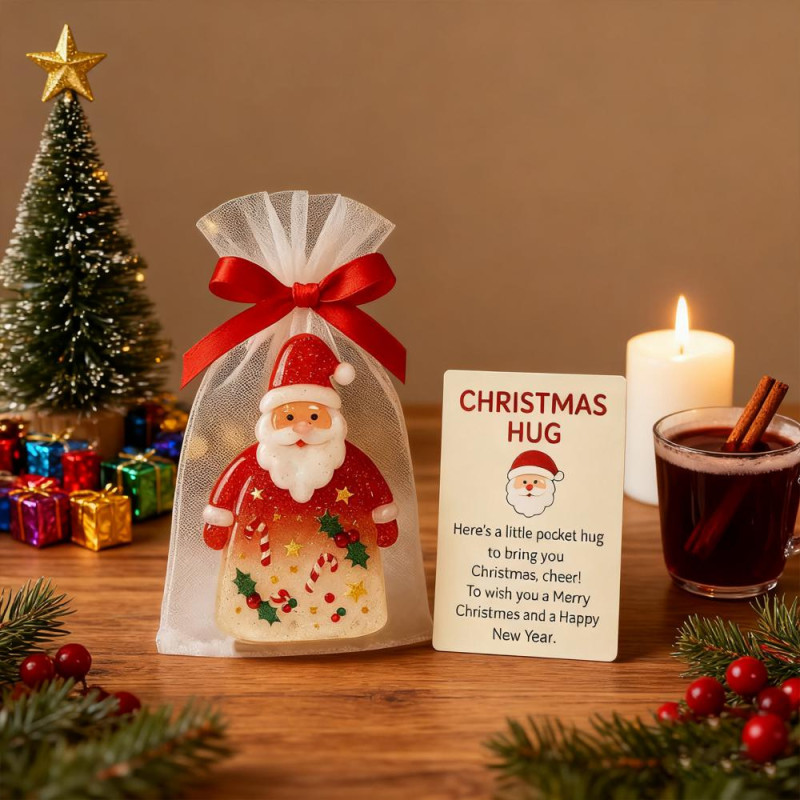 Festive Santa Design: Bright colors, sparkling details, and festive joy encapsulate this pocket hug. It's not just a decoration; it's a heartfelt reminder that someone cares deeply about you. Heartwarming Gesture: This small pocket Christmas hug conveys love and warmth, perfect for showing loved ones you miss them during the holidays. Its cute design exudes happiness and festive cheer, akin to receiving a warm hug from Santa himself. Thoughtful Packaging: Each Santa's hug comes elegantly packed in a delicate transparent tulle bag with red ribbons, ready for gifting at any moment. The included matching card adds an extra touch of holiday sentiment, making it a truly special present. Versatile Gift Idea: Ideal for family, friends, colleagues, teachers, or anyone in need of extra love during Christmas. This pocket hug is a thoughtful gesture that spreads joy and affection during the festive season. Portable Cheer: Whether tucked into stockings, Christmas cards, or given as a surprise gift, this pocket hug brightens the holiday season with its festive design and heartfelt message of care and connection.