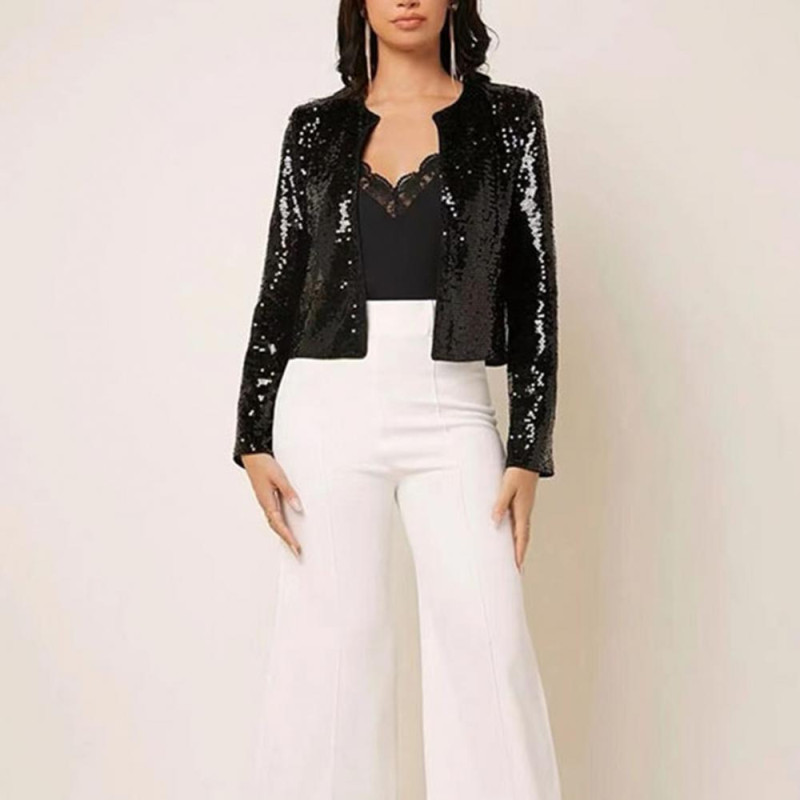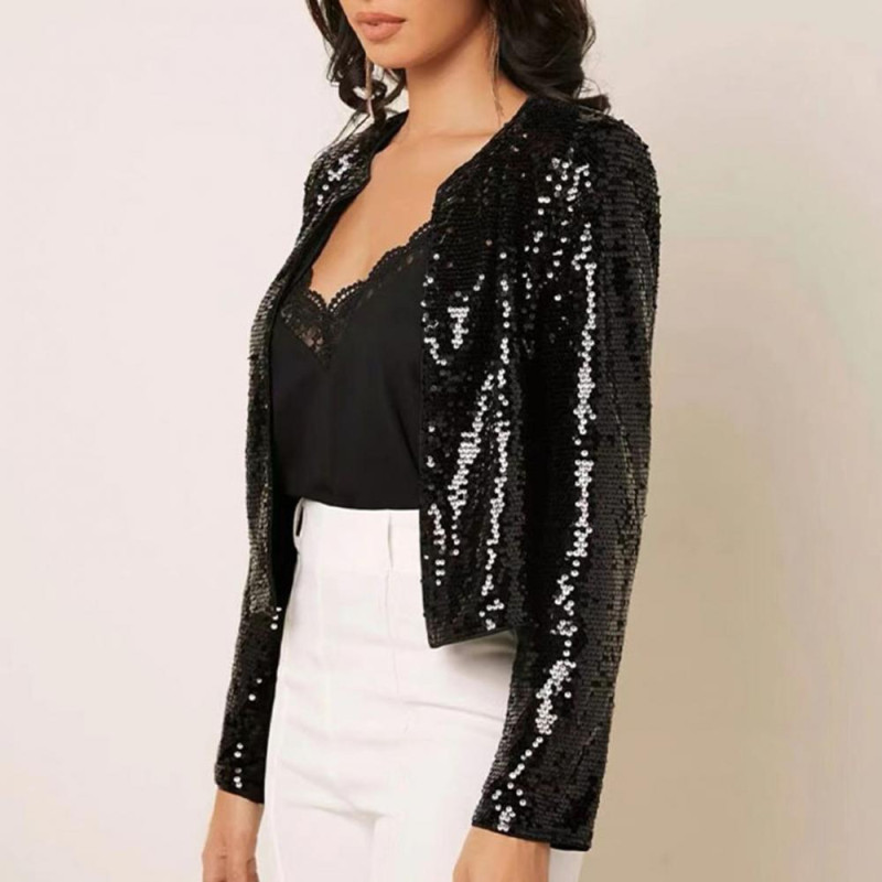 Party Blazer Sequin Decoration Crew Neck Long Sleeves Slim Fit Cardigan Dress Up Streetwear Women Open Front Sequin Jacket Female Clothing