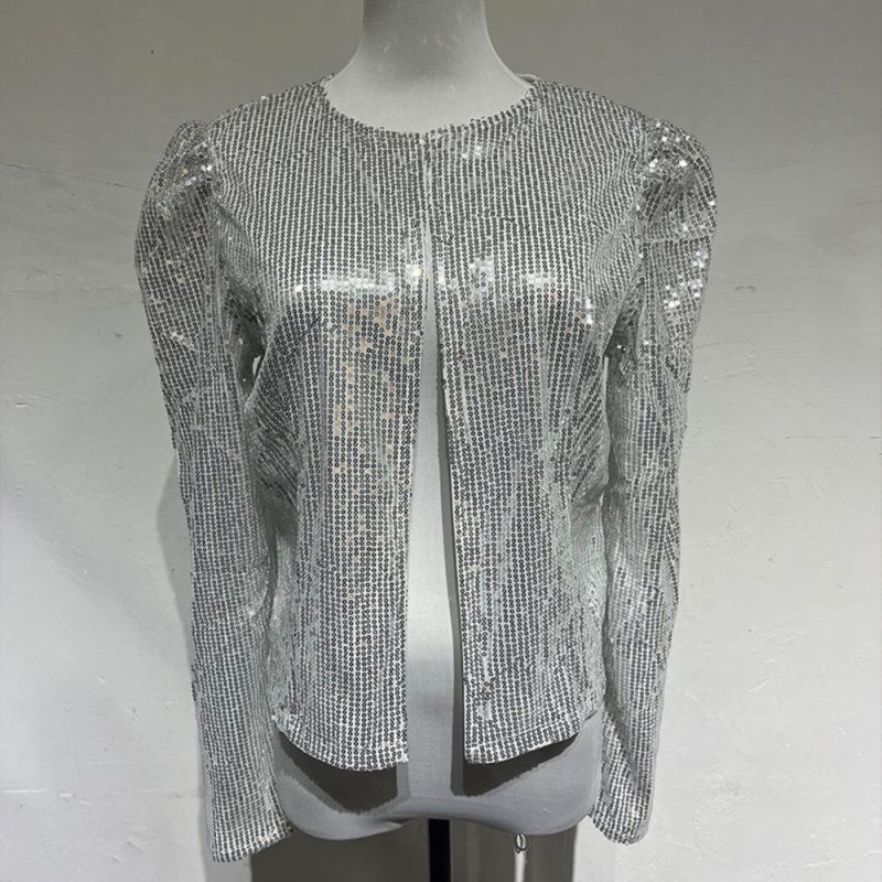 Characterized by open front, long sleeve, puff sleeve, all over sequin with lined and solid color features, this jacket coat is a perfect outfit, which can add a sense of charming, textured, chic and attractive.