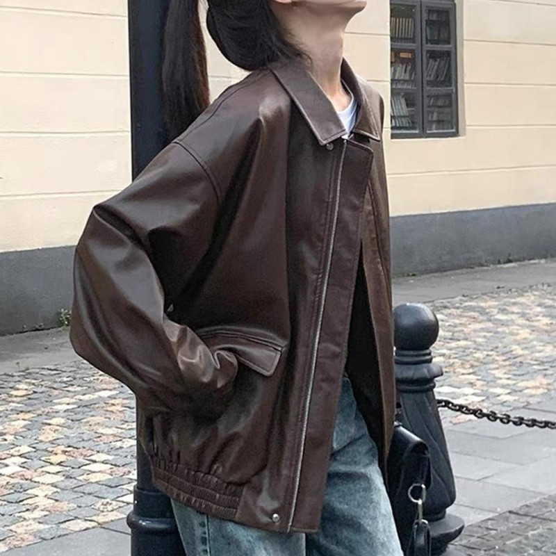 Women Jacket Faux Leather Smooth Surface Turn-down Collar Zip-up Long Sleeves Elastic Hem Pockets Retro Motorcycle Coat