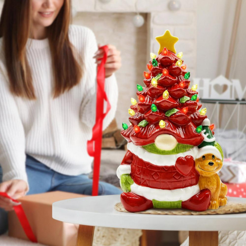 10 Inch Lighted Christmas Gnome Tree Resin Reindeer/Santa Dog Gnome Tree with LED Light for Home Office Fireplace Mantel Tabletop Decor